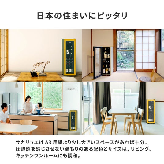 日本の住環境に合わせて開発した「サカリュエ 潤金」は、スリムな設計ながら22本のボトルを収納可能。ボルドーやブルゴーニュ、シャンパン、日本酒の一升瓶まで、幅広いサイズに対応します。