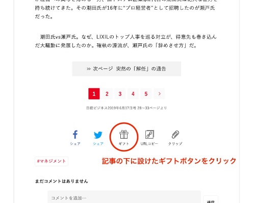 日経ビジネス電子版は7月16日、有料会員がお知り合いに有料記事をプレゼントできる「ギフト機能(β版)」を追加しました。有料記事に設けた「ギフトボタン」を押してシェア用のURLを発行。そのURLをメールやSNSで送れば、どなたでも無料で記事をお読みいただくことができます。具体的な使い方をご紹介します。