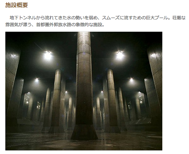 å¼ççæ¥æ¥é¨å¸ã®ãé¦é½åå¤éæ¾æ°´è·¯ãã¯ãå½é16å·ç·ã®å°ä¸ç´50ã¡ã¼ãã«ã«ãããå»¶é·6.3ããã¡ã¼ãã«ã®å°ä¸æ¾æ°´è·¯ã§ããæ²³å·ããæ´ªæ°´ãåãå ¥ãããæµå ¥æ½è¨ããå°ä¸ã§è²¯æ°´ã»æµä¸ãããå°ä¸æ°´è·¯ããå°ä¸æ°´è·¯ããæ´ªæ°´ãæåºãããææ°´æ©å ´ããªã©ããæ§æããã¦ãã¾ãã