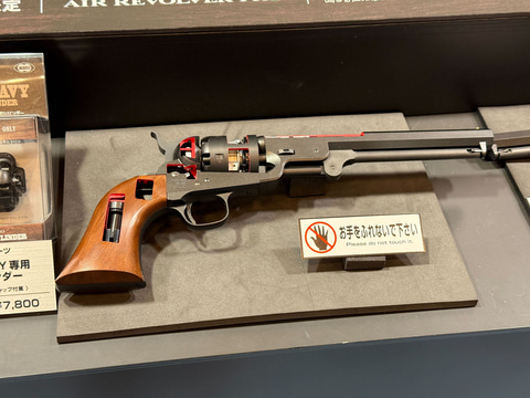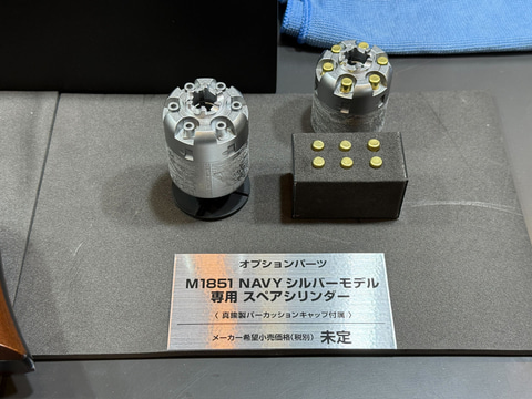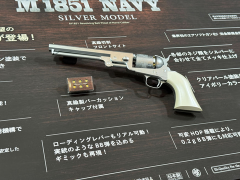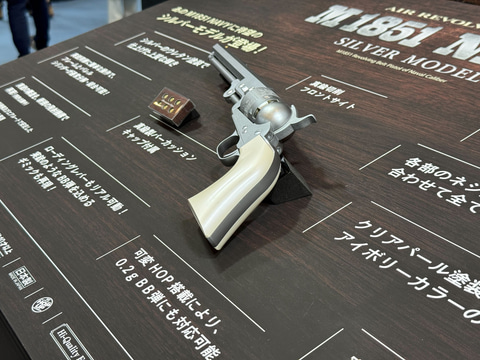 エアコッキングガン「M1587 NAVY SILVER MODEL」は、「M1587 NAVY」のシルバーモデル。本銃が活躍した西部開拓時代、銃のさびを防ぐためニッケルでメッキをしたバージョンを再現。フロントサイトは真鍮切削、各部のネジ類もメッキ仕上げ、象牙を思わせるグリップはクリアパールが施されている。スペアシリンダーも登場予定。