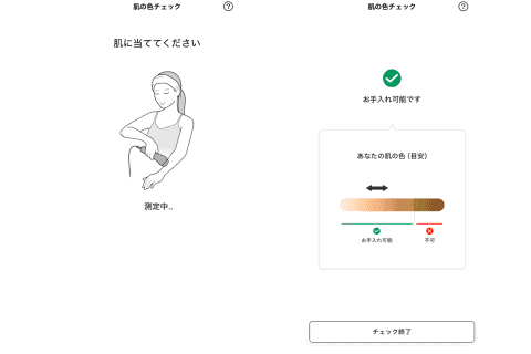 本機はスマートフォンとの連携が可能で、初心者をサポートする機能がとても充実しています。まず「使用できる肌の色」をチェックできる機能があり、どの程度の日焼けまでなら使えるのかといった基準がやや曖昧になりがちな部分を、わかりやすく示してくれるので安心です。