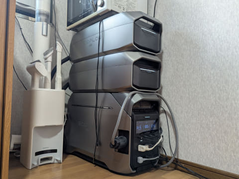 斎藤氏が拠点としているのは山形県上山市にある築約50年の古民家。ライダーハウスとしてのプレオープン中です。蓄電システムのメインとなるのはエコフロー「DELTA Pro 3」。家庭用の配電方式として一般的な「単相三線式」の入出力を備えているのがポイントで、分電盤を介して家庭内の配線に接続すれば家電をそのまま動かすことができます。この機能に対応していないと、蓄電池本体からタコ足配線を伸ばすことになるので、家庭用の電源として活用するうえで重要な機能といえるでしょう。