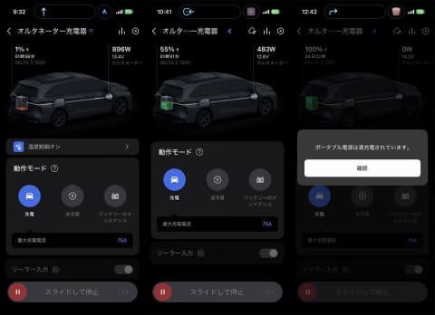 「軽自動車でオルタネーターの容量が低いせいか、900Wを超えるのは下り坂でエンジンブレーキをかけたときか、アクセルを踏み込んで高回転まで回したときくらいでした。とはいえ、800Wの製品はそれより発電量は少なかったので、移動中の充電がさらに高速でできるのはありがたいですね」(斎藤氏)