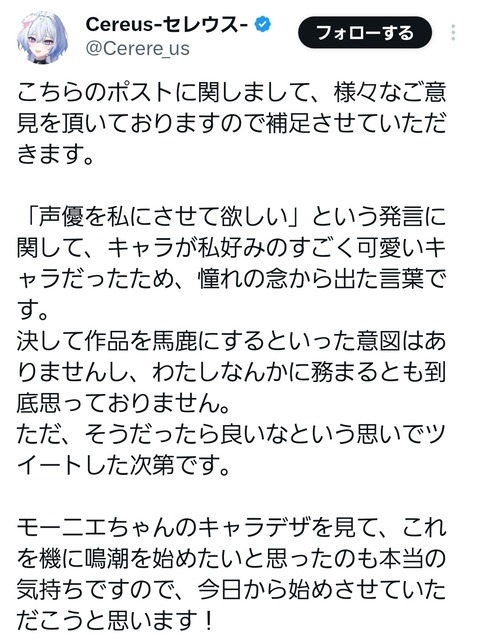 【画像】VTuber「このキャラ私に似てるから声優やってみたい!」←オタクブチギレで謝罪させられるwww