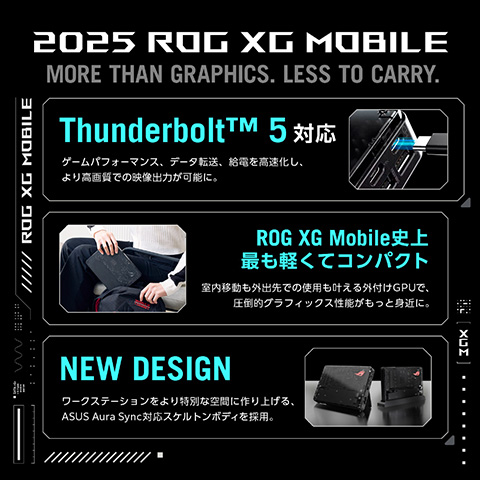 ROG XG Mobile (2025)はノートPC向けのGeForce RTX 50シリーズを採用した外付け型のGPU。ケーブルを用いて外付けユニットとPCを接続する形式で、ビデオカードを内蔵できないノートPCや小型デスクトップPCでも使用できる。