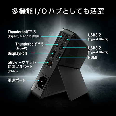 PCとの接続ポートとしてThunderbolt 5を採用した。Thunderbolt 5の広い帯域幅により、高フレーム/高解像度ゲーミングを実現するなどとしている。また、PCにLAN、HDMI、DisplayPortなどのポートを増設することもできる。