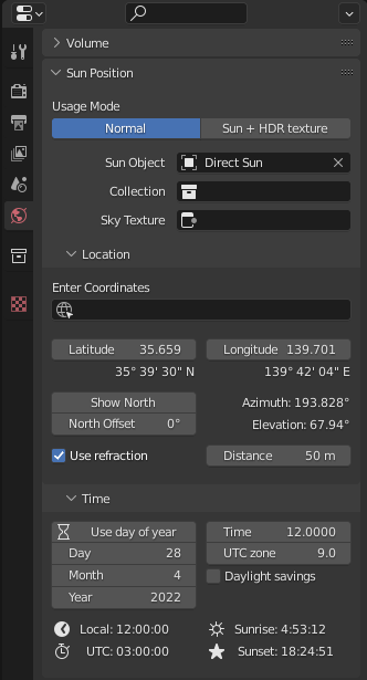 太é½ã®ä½ç½®ã¯ã緯度çµåº¦ãæ¥ä»ãæå»ã«ãã£ã¦ä½ç½®ã決ãããã¾ãã ãããå©ãã¦ããããã©ã°ã¤ã³ãSun Positionã㯠Blender ã«æ¨æºã§çµã¿è¾¼ã¾ãã¦ãã¦ããããç¡å¹ã«ãªã£ã¦ããã®ã§æå¹ã«ãã¾ãï¼