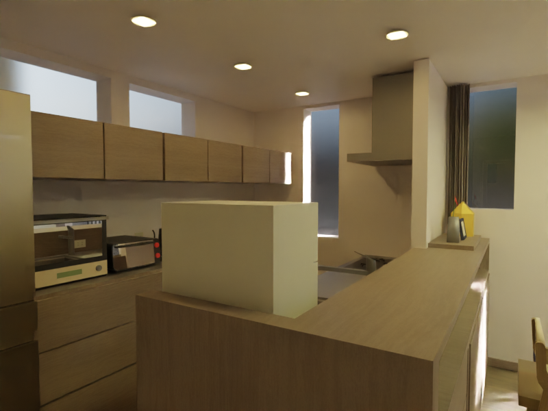 ãããã¦å æºã追å ãã¦ã¬ã³ããªã³ã°ãã¦ã¿ãã¨æåã¯æãæããã¯ãã§ããããã¯ã«ã¡ã©ã®é²åºã®åé¡ã§ããããã©ã«ãå¤ã®1.0ã®é²åºã§ã¯ç´å°æ¥å ã®å½ããå¤ã«ã¡ããã©ãããããã®é²åºãªã®ã§ãBlender ã® Render Properties ã® Film ã® Exposure ã 1.0 ãã 3.0 ãããã¸å¤ãã¦ãããã¨ã室å¤ã¯ç½é£ã³ãã¾ãã室å ã«ã¡ããã©ããé²åºã«ãªãã¾ãï¼