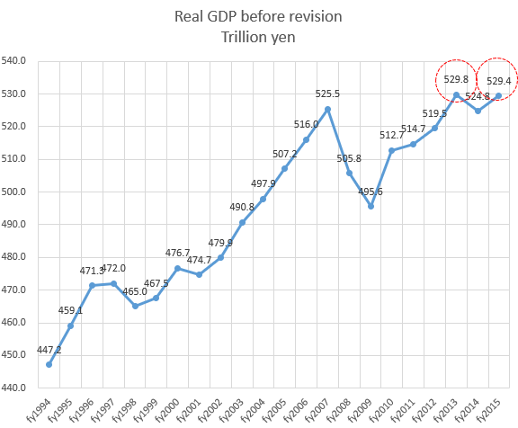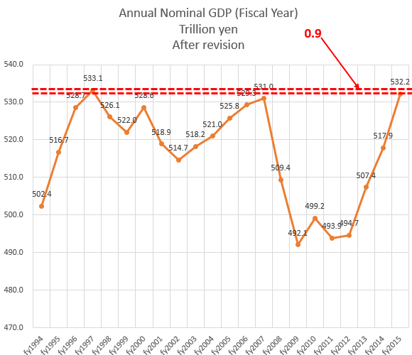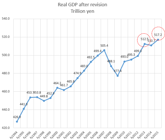 This graph is before revision. The nominal GDP in 2015 was 20.7 trillion yen different from the previous record high in 1997.