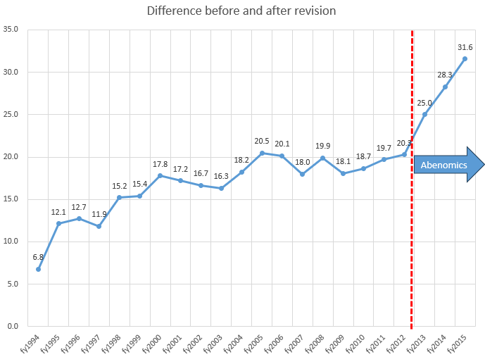 In this way, GDP in the 1990s was significantly reduced, and only GDP after the start of Abenomics was significantly inflated.