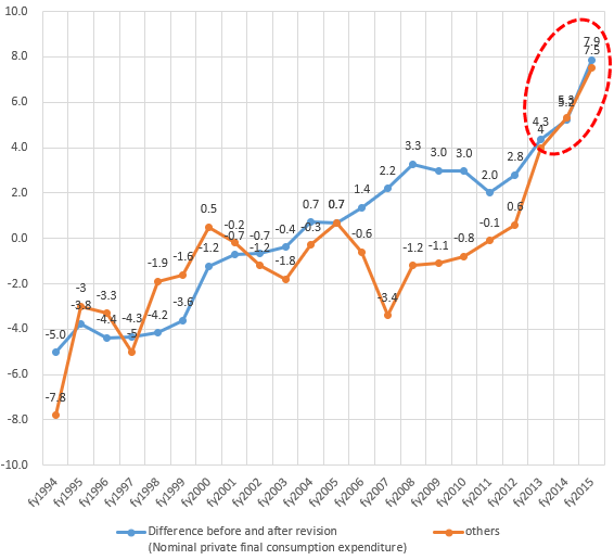 Regarding this nominal private final consumption expenditure, let's look at a graph that shows the difference between the figures before and after the revision and the amount inflated by Sonotanomics.