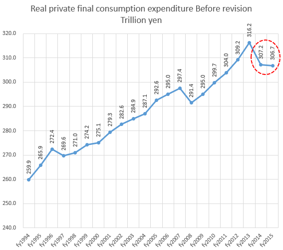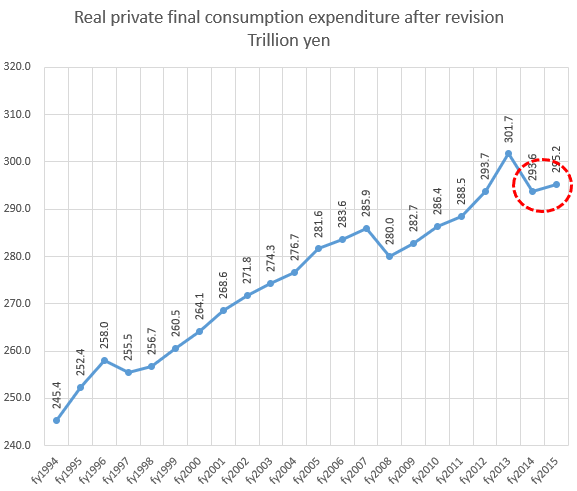 This was the first time since the Pacific War that Japan had not been able to update its real private final consumption expenditure for six years. In other words, the worst consumption stagnation since the war had occurred.