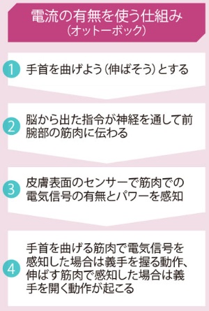 筋電義手の操作には大きく2種類の方式がある。世界最大手であるドイツのオットーボックは、筋肉に伝わる電気信号の有無や強弱を使った仕組みを採用する。同社は第1次世界大戦で負傷した兵士に義肢を提供するため、1919年に創業した老舗。88年のソウル大会以来、パラリンピック選手が使用する機器の修理なども手掛けており、世界で圧倒的シェアを誇る。