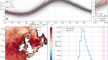 We assess heat waves by the Excess Heat Factor99 (EHF) used in operational forecasts as well as in research studies15,16,100. The EHF index (Eq. 1) is defined by combining two excess heat indices, namely an acclimatization index (Eq. 2), which measures the current 3-day temperature anomaly relative to the previous 30-day period; and a significant exceedance index, which measures the excess 3-day temperature over a high threshold, taken here as the 95th percentile temperature for that given day (Eq. 3). Here, Ti corresponds to the daily maximum surface temperature for day i and T95 is the 95th percentile temperature for that given day. A positive EHF characterizes heat wave conditions that persist for a minimum of three days.
