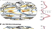 The mean precipitation in ModE-RA depends on the jet characteristics. During the cold season (Fig. 1, right column) it increases in the British Isles and Scandinavian region with a strengthened jet, and during both seasons it decreases in Western and Central Europe with a poleward-shifted jet (Extended Data Fig. 2). The patterns follow the inverse blocking frequency more than the cyclonic activity (this may be different for extremes) and are modified by the orography. Correlations of the warm-season ModE-RA jet latitude with precipitation or drought variables from other reconstructions27,28,29,30 (including an independent one30) confirm the results (Extended Data Fig. 4).