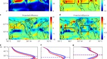 where S o denotes the rate of ocean heat storage, R surface is the net downward radiative flux at the surface, SH and LH are the surface upward sensible and latent heat fluxes, and F o denotes the oceanic heat transport. The difference from the derivation in atmospheric energy transport is that the ocean heat storage can’t be neglected in the long term as climate warms. The heat storage rate is defined as the oceanic potential temperature difference between years 1961–2000 and years 2081–2100 integrated over the ocean depth, multiplying by the sea water density and heat capacity, divided by the time period of 110 years. It is quite uniformly distributed over latitude and is calculated to be about 1.5 W/m2 on global average (consistent with Russell et al. (2006a)). Increased heat storage is relatively larger over the Southern Ocean and smaller over the North Atlantic region (not shown). Figure 13a shows the climatological meridional total, atmospheric and oceanic energy transport derived from the energy balance requirement. Taking the differential ocean heat storage rate into account, Fig. 13b shows the change in total, atmospheric and oceanic heat transport in the future climate. It is noted that the oceanic heat transport decreases almost everywhere whereas the atmospheric heat transport increases. Held and Soden (2006) pointed out that the reduction in meridional ocean heat transport serves as a compensation for the increased poleward latent heat transport in the atmosphere.