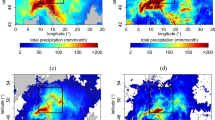To verify simulated cyclone precipitation against observations, an object-based measure of the Structure, Amplitude, and Location (SAL) of the precipitation field in a pre-specified domain was calculated according to Wernli et al. (2008). A 30 × 30 model grid box, centered on the E-OBS’ precipitation maxima and threshold factor of 1/15 to identify objects was used to calculate SAL. An object defines a grid point of a local precipitation maximum above threshold values, which includes neighboring grid points as long as the grid point values are larger than the threshold values (Wernli et al. 2008). The amplitude component A of SAL describes the normalized domain averaged field difference of the simulated and observed precipitation. Its values range from − 2 to + 2, with 0 indicating a perfect forecast and − 1/+ 1 indicating underestimation/overestimation of spatially averaged precipitation by a factor of 3. The structure component S describes the volume of the normalized precipitation object, using its size and shape. It ranges from − 2 to + 2 with 0 indicating area similarity of simulated and observed precipitation object. The third component, location L, computes the normalized distance between the center of mass of the simulated precipitation object and observed one. Additionally, mean differences in daily precipitation values of simulations and observations were used as simple statistical measures.