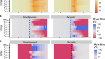 RegCM4 assumes precipitation occurs below a rain-snow threshold temperature (Th) of 2.2â°C is all snow, and other models assume Th is 0â°C. To better account for observed rain-snow partitioning in the Sierra Nevada, the reference data is assumed to have a linear change of snow percentage from 0â3â°C28,29. The difference in Th introduces an additional â27% underestimation in \(\widehat{SWE}\) in CRCM5, CanRCM4 and WRF, and 13% overestimation in \(\widehat{SWE}\) in RegCM4 (Fig. 3, row \({\varepsilon }_{Th}\)).