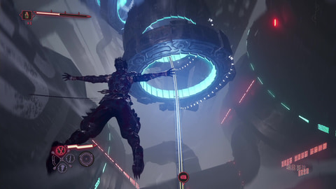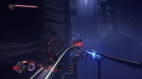 中尾氏:具体的な案ではないですが、今のレールや鴉忍具の塩梅、その規模感は、大規模なものだった時期がありました。今はステージに溶け込ませて加速感を足すように入れ込んでいますが、元々は、そのとき限りの特別なシチュエーションがすごい多い構成で構想していたんですね。ですが、やはり「NINJA GAIDEN」は“バトルが面白い”というところに辿り着くゲームだと思います。バトルが希薄になってしまうシチュエーションは「NINJA GAIDEN」というゲームにおいてはシナジーしきらないものなんだろうと、作っている中で話し合いまして、今のバランス感になりました。今は立体的なゲームの遊びを入れてはいますが、自由だったがゆえに逆にバトルのバランスが合わなくなってしまっていた、といったところも結構悩んでいましたし、ずっと話し合ってバランス調整していきましたね。