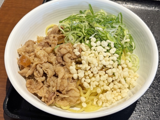 黄色い麺の上に牛肉、玉ねぎ、青ねぎ、天かすがトッピングされています。