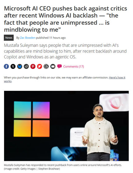 WindowsのAI製品への批判を受けMicrosoftのAI責任者が冷笑系にウンザリ、「超賢いAIに感心しないなんて信じられない」と語る
