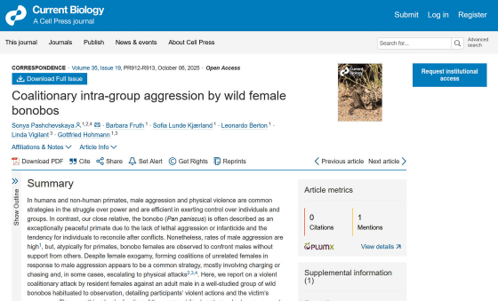 しかし、平和なことで知られるボノボであってもオス同士の攻撃は一般的だそうで、メスのボノボたちはこれに対抗するべくチームを組むことも確認されています。こうしたメスによる連合行動は、ボノボの社会におけるメスの優位性の基盤になっているとみられ、これがボノボの社会において致命的な攻撃や子殺しが少ない理由かもしれないとのこと。