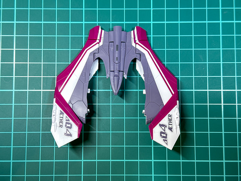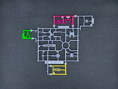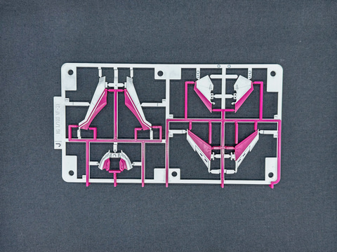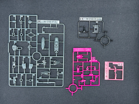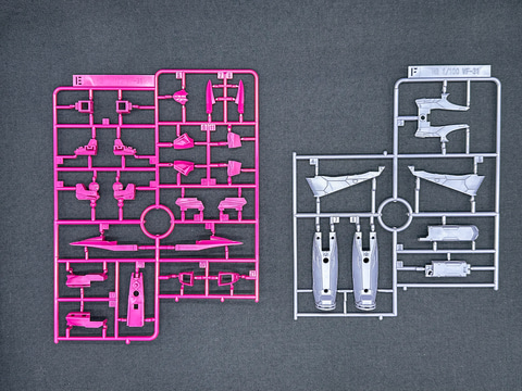 「VF-31」系キット最大の特徴としてインサート成形を採用したパーツが挙げられます。J型のキットでは青色と白色の2色で成型されたパーツが採用されましたが、本機では赤紫色と白色の2色でインサート成形が採用されています。特に主翼部パーツにはインサート成形パーツが多く採用されており、印象が大きく変わります。