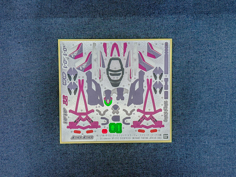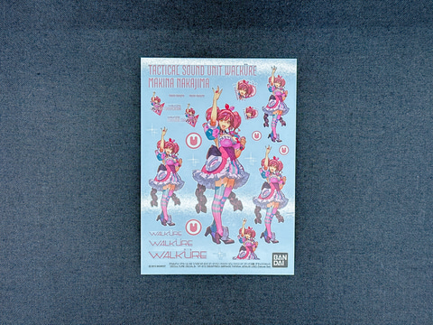 最初に付属するランナー等を見ていきます。本キットもVF-31Cを構成するパーツの他に専用水転写式デカールとマキナ・中島のアクリルスタンドが付属します。本アクリルスタンドのデザインも『マクロスΔ』キャラクター原案・実田千聖氏(CAPCOM)による新規描き下ろしイラストを使用したものとなります。