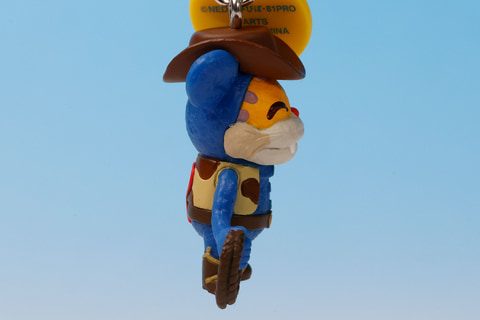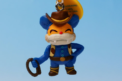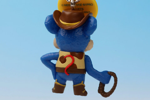 カウボーイハットのみならず、ベルトやブーツなどもカウボーイをイメージしたようなデザインを身に着けている。また、手にはムチを握り締めているところもイメージ通りだ。ニャンちゅうの口元はしっかりと閉じているのだが、それでも2本の歯は飛び出している。