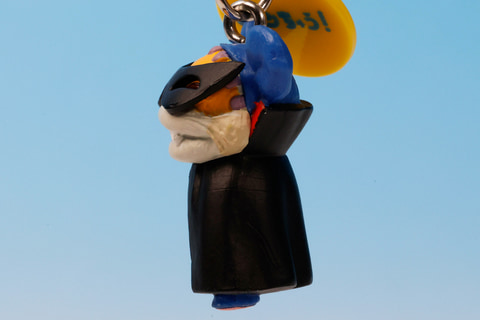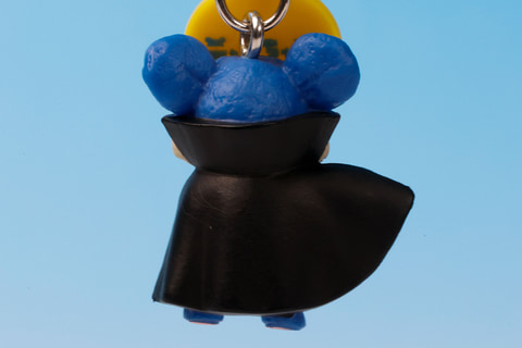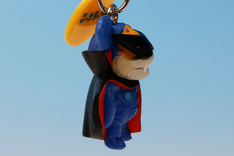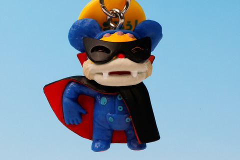 ドラキュラっぽさを演出するために、ニャンちゅうの目は黒い仮面で覆われている。また、背中にはかなり大きめのマントを身に着けているところもカッコイイ。このマントも、内側が赤く外側が黒い点もドラキュラらしい。