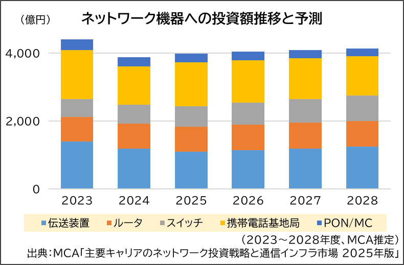 国内キャリア機器投資は2024年度に約3900億円、国内ネットワーク機器市場は伝送装置と基地局が60%を占有
