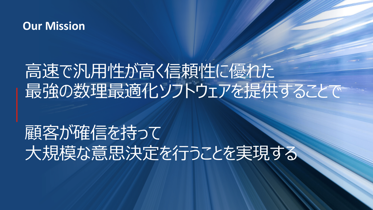 私たちの使命はシンプルで明確です。最も強力で、最速で、最も汎用性が高く、最も信頼性の高い数理最適化ソフトウェアを提供し、企業が大規模な意思決定を確信をもって行えるよう支援することです。