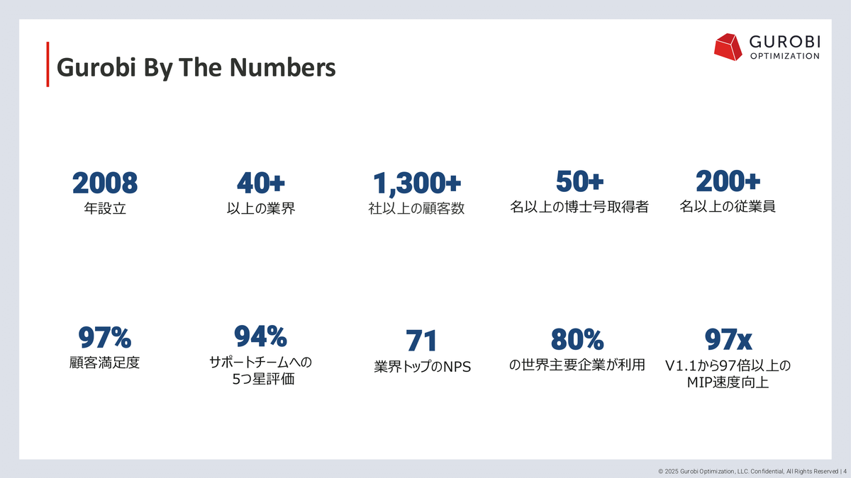 まず、Gurobi Optimizationという企業について紹介します。私たちがどのような存在か、何を原動力としているか。そして当社の技術がどのように変化をもたらすかについてお話しします。
