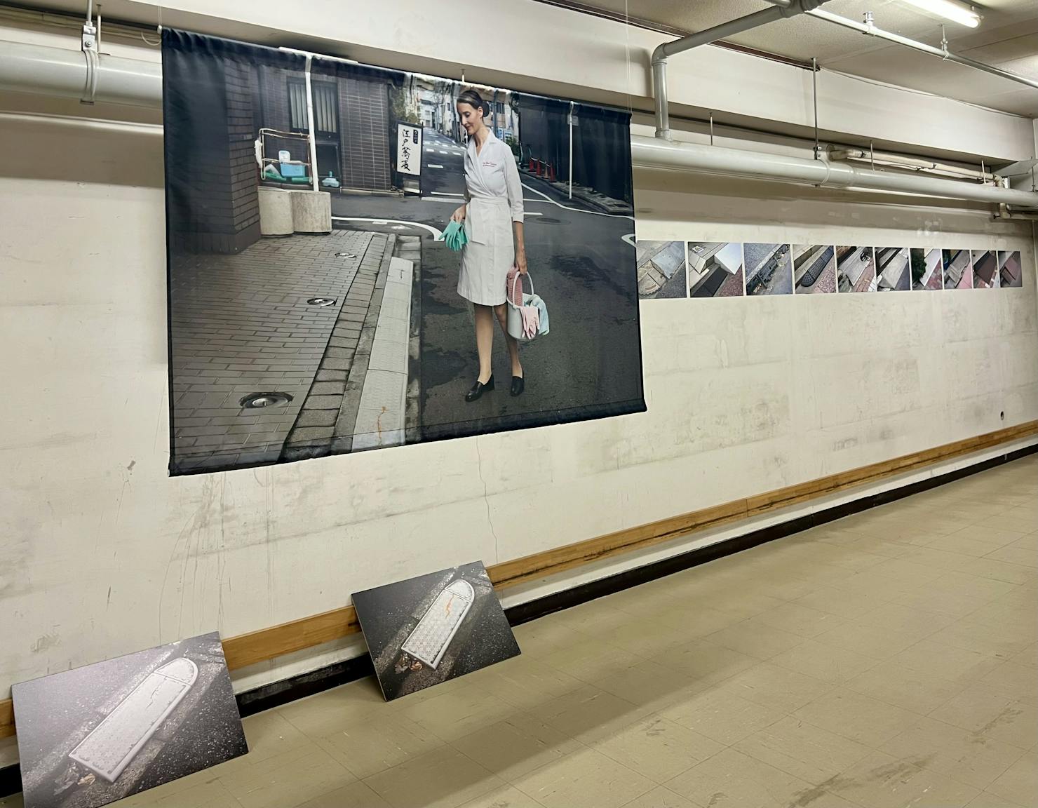 ドイツ出身のエルケ・ラインフーバーは、今回1400組あまりの応募があった海外アーティスト公募プロジェクトで選出され、《都市のエステティシャン》なる作品を出展。白衣姿で日本橋を歩いた彼女は、ひび割れた縁石スロープに着目し、金継ぎによってこれを修復。その記録を展示した。