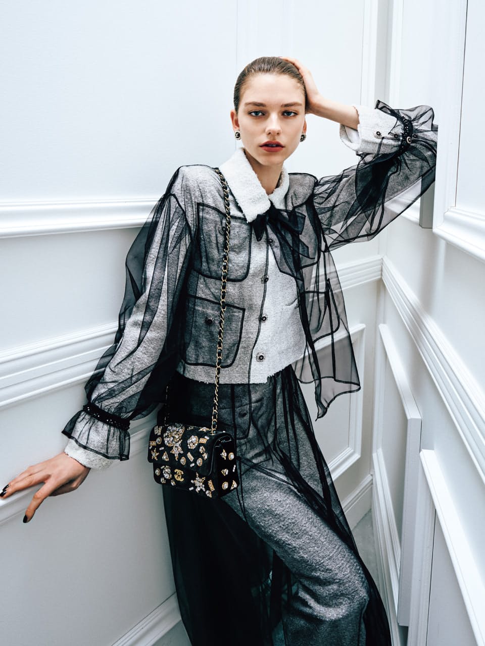 ボリューム感やレイヤリングで遊びを効かせ、メゾンのコードを幻想的な雰囲気で再解釈した、シャネルの秋冬 プレタポルテコレクション。象徴でもあるツイードに、透明感のあるブラックなチュールを重ね、新鮮な軽やかさを。アトリエ モンテックスが手がけた、ラインストーン、パール、クリスタルビーズをあしらったフラップバッグは、35時間かけて刺繡が施されたという、なんとも贅沢な一品。ジャケット¥1,351,900、パンツ¥825,000、チュールブラウス¥789,800、スカート¥456,500、バッグ(W20×H12×D6㎝)¥3,621,200/シャネル【THE NIKKEI MAGAZINE Ai 2025年9月28日 発行号表紙】