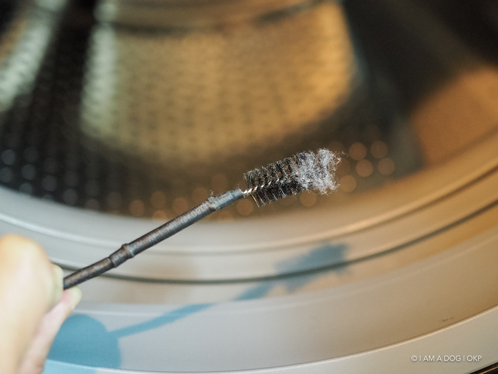 こんなもので埃が取れるのか?と思うかもしれませんが、手近な埃に当ててみると驚くぐらいに埃を掴んで離さないのが分かります。乾燥フィルター内の掃除機では吸い取れなかった隅っこの埃も、ブラシを当ててみると嘘のように絡め取れます。