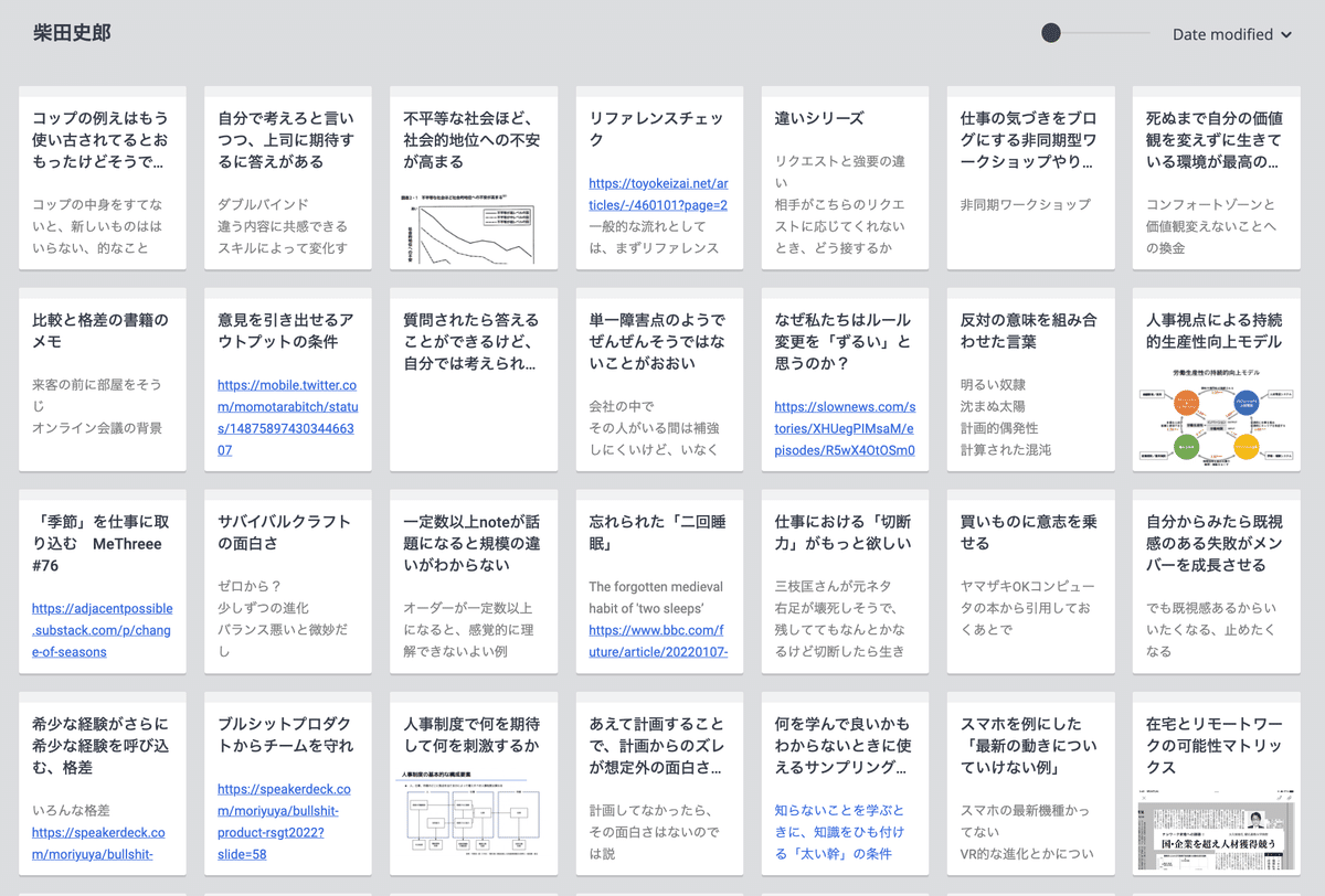 あとは、誰かに積極的に話したいことではないけど、まとめておきたいもの。社内外問わず適当にシェアしておくことの意味がある。偶然の要素が何かを産むから、仕事の時間を使って良い。これも本人の役割によって許されるかどうか決まる。