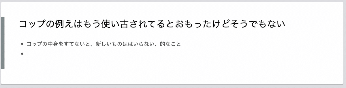 研修講師が「コップの水を捨ててからじゃないと、新しいものを手に入れられない」という話をしていた。私はそれを聞いて「その例え話は、使い古されてる感じもするけど・・・」と思った。しかし、その後の参加者の反応で「コップの例えがなるほど、と思いました」とコメントが。