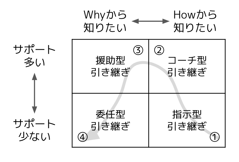 ・引き継ぐ側:基本的なHowは教える。ただ、引き継がれる側にWhyも伝えて、「1.指示型」よりは仕事のやり方を自分で考えてもらう