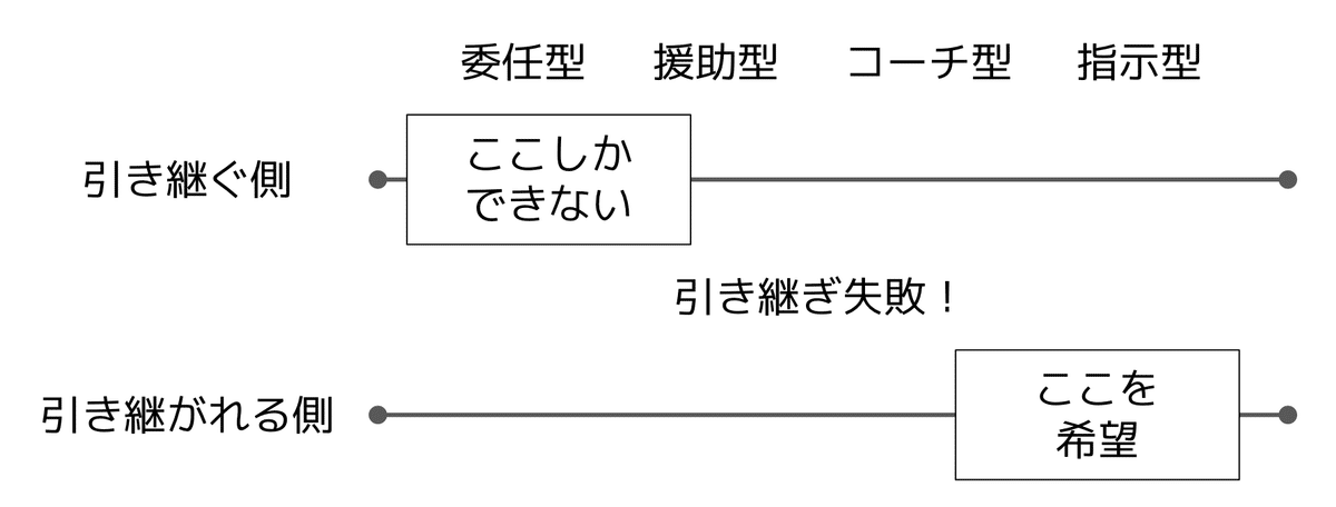 引き継がれる側は「指示型」を望んでるのに、引き継ぎ側は「委任型」しか知らないパターンなど。私は委任型の引き継ぎしかできないので(=ほぼ丸投げ)、よく事故が発生していた。最近はちょっとだけ援助型もできるようになったかも・・・。