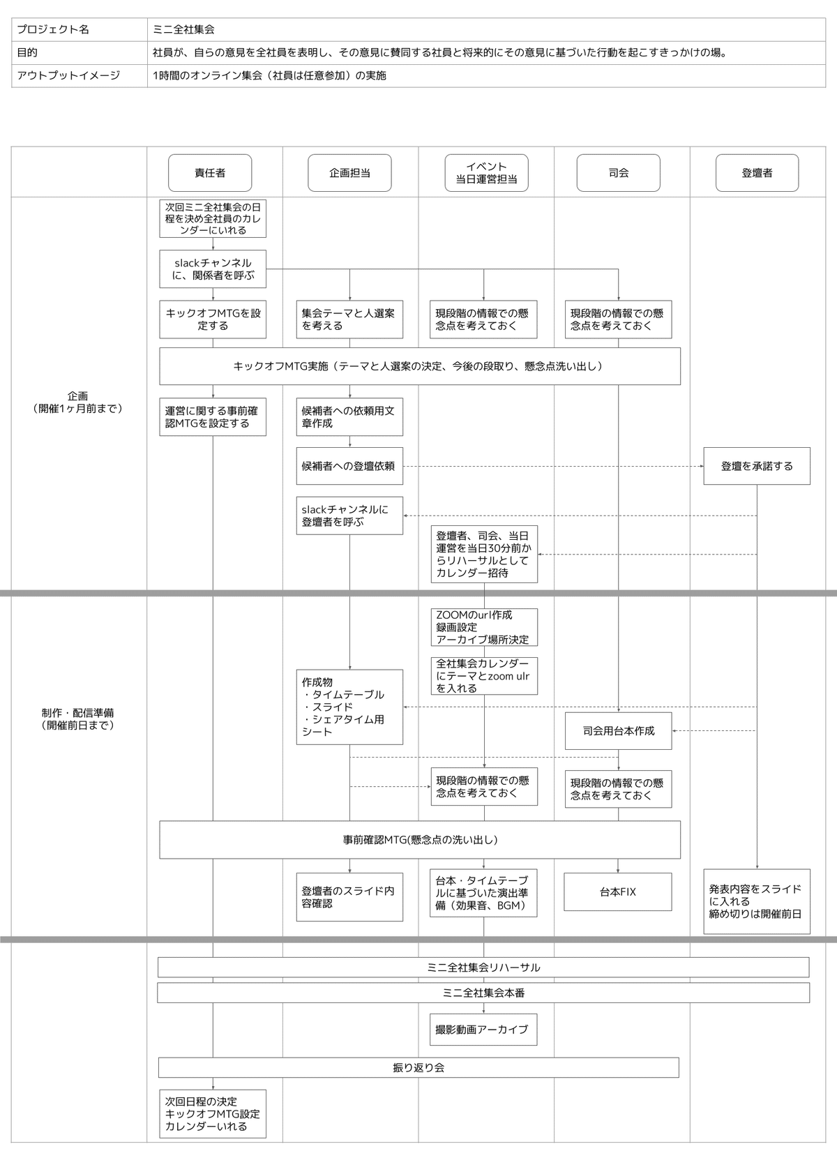実際に私が社内のオンラインイベントの業務を書き出してみたものを紹介する。社員2名でなんとなくすすめていたものを、何も知らない人に引き継ぐとするとどうするか、という観点からやってみた。