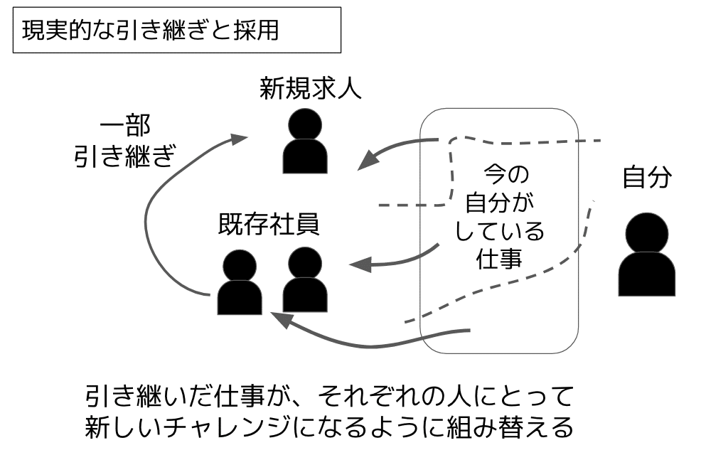 どうするか。複数の人に仕事を分割して引き継ぐ。その中に新規求人もあっていい。自分以外の仕事も含めて、業務を組み替える必要がある。全員にとって、新しい引き継ぎ業務がチャレンジになっている必要がある。
