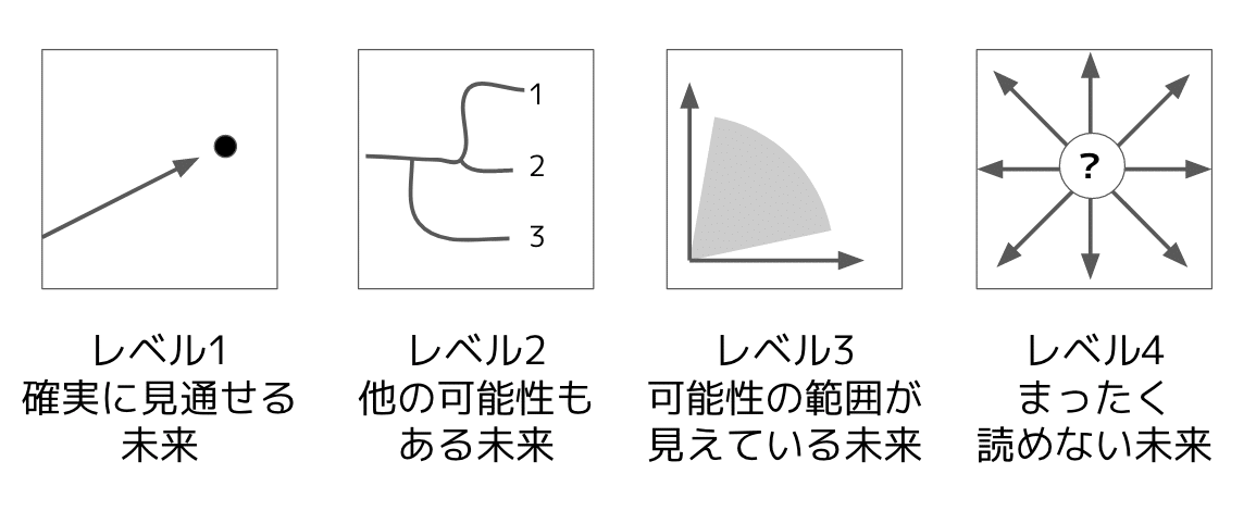 この分類を知らないと、今後の見通しを説明するとき、「わかってる(レベル1)」「わかってない(レベル4)」の2分類でざっくり引き継ぎしてしまう。実際には、「この3パターンのどれか(レベル2、複数シナリオ)」とか「AからBぐらいの幅で発生する(レベル3、見通しの幅はわかる)」とか、見通しはもうちょっと細かく説明できる。