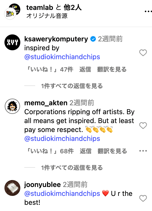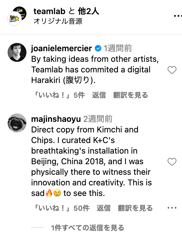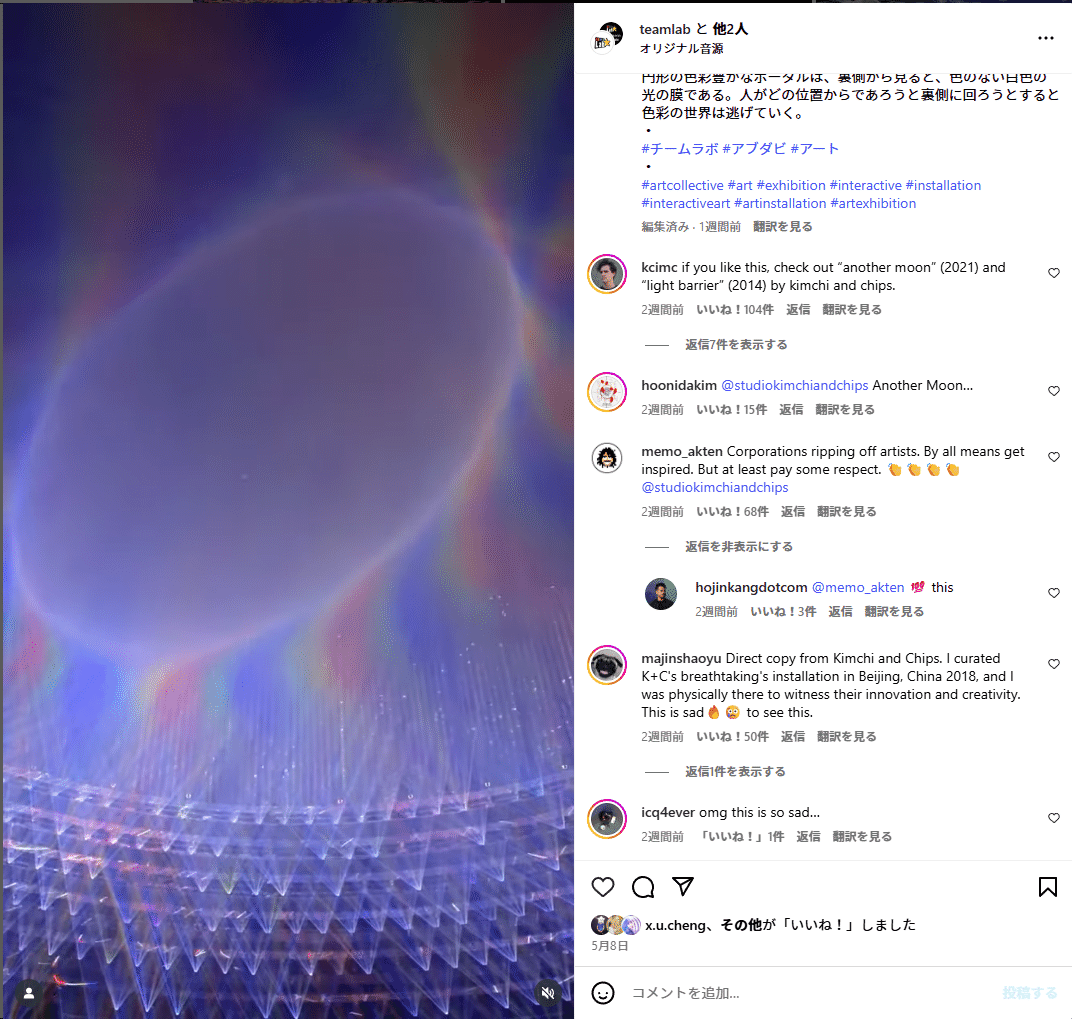 彼ら/彼女らは、チームラボの作品に@Kimchi and Chips とタグ付けをして、「完全にKimchi and Chipsのコピー。オリジナルの方が良いからこれじゃなくてKimchi and Chipsを見て」「私は北京でKimchi and Chipsの素晴らしい作品のキュレーターを担当した。このような直接的なコピー作品を見るのは本当に悲しい」「コピーならコピーでリスペクトを表すべき!」など、それぞれの意見を表明している。今現在も、その怒りのコメント投稿は勢いを増すばかりである。下記にコメント欄に投稿された意見を貼る。