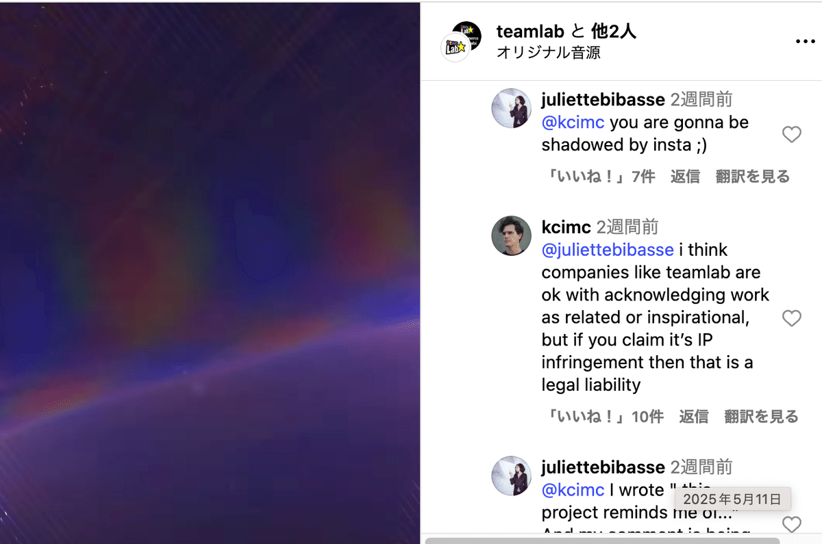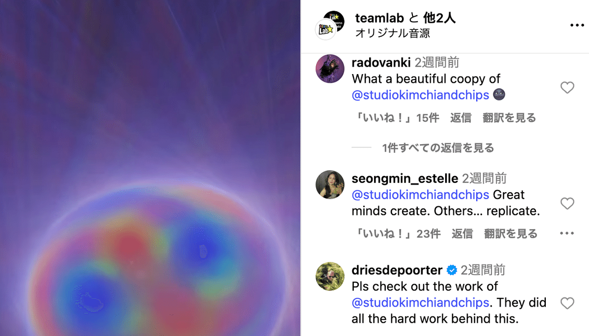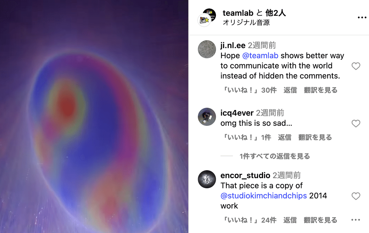 下記画像がインスタ上での大議論。“teamLab Phenomena Abu Dhabi”(2025)をチームラボが投稿したコメント欄において、世界中の高名なメディアアーティストやキュレーターがこの"コピー騒動"について怒りを表明している。