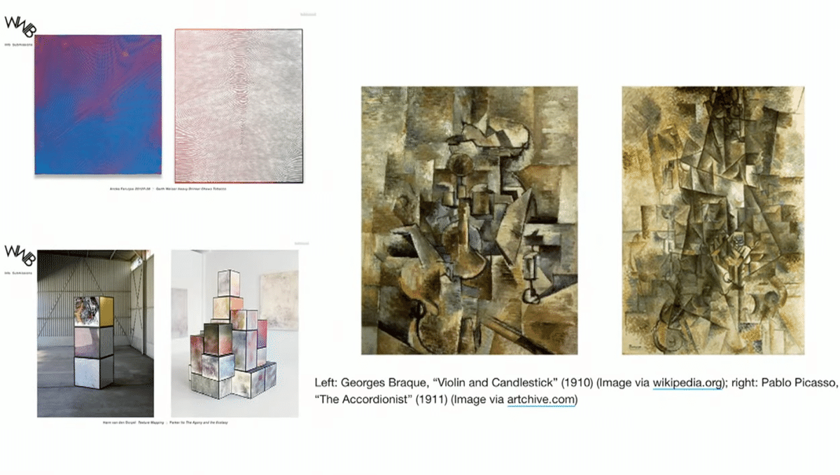 例えば、ピカソですら"クリプトムネジア"をやらかしたりする。上画像の右側の比較は、左側がジョルジュ・ブラック「ヴァイオリンとろうそく立て」(1910年)で、右側がパブロ・ピカソ「アコーディオン奏者」(1911年)。こういったことは列挙に暇がなく、"非難すべきこと"では無かったりするのである。