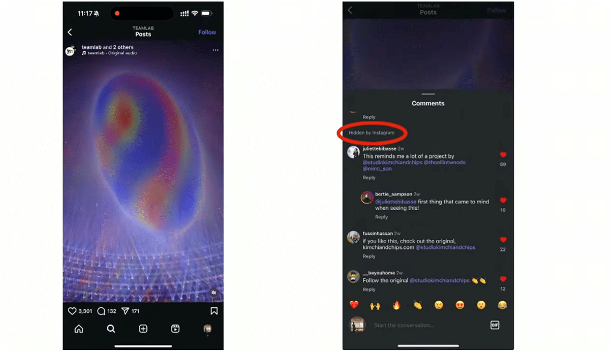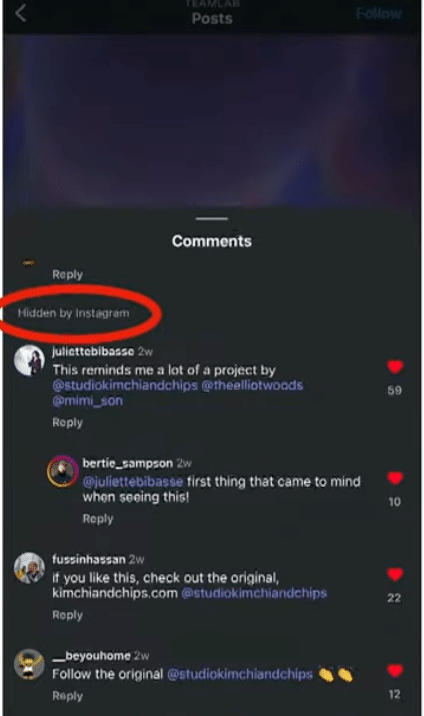 インスタグラムにおいてKimchi and Chipsに言及したコメントをチームラボ側が"非表示"にしている