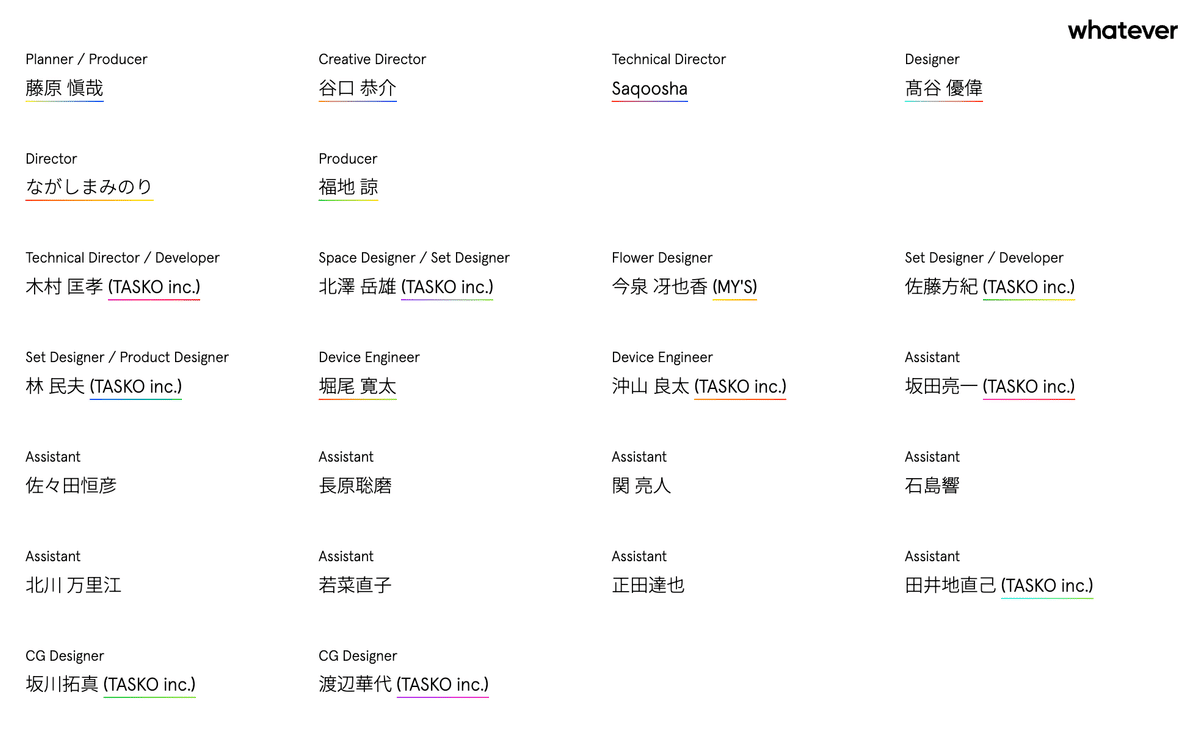 他のテック・アーティスト/クリエイティブスタジオの通例とは違って、チームラボの体質として特徴的だと思うのは、現場で手を動かしているクリエイターの個人名を積極的に打ち出さないように見えることです。コンテンポラリーアートの世界では、いわゆる"裏方"の名前が出ることは異例ですが、チームラボがいるのも"コンテンポラリーアート"の文脈であるのかもしれません。問題なのは、我々がチームラボを同時代のテック・アーティスト/クリエイティブスタジオと並べて語ってしまうことにあるのかもしれません。