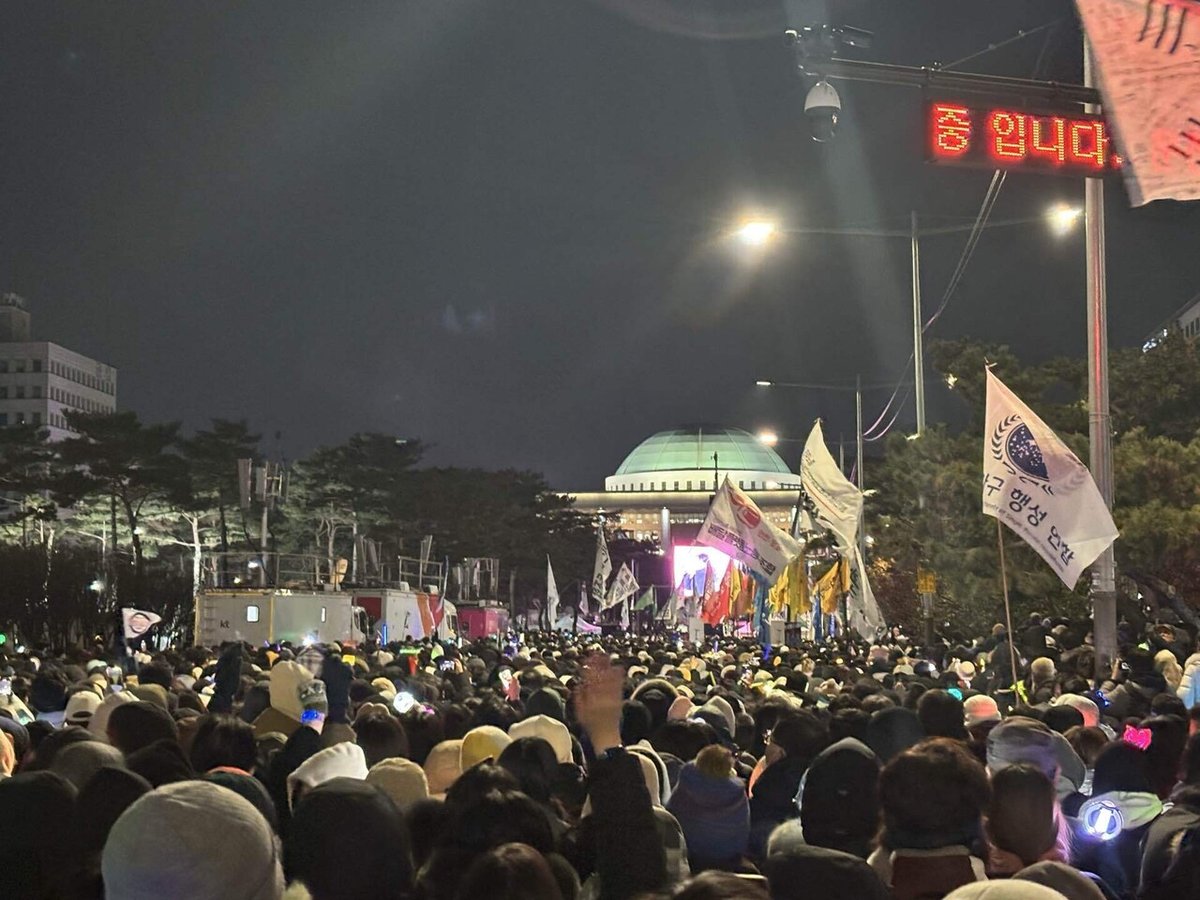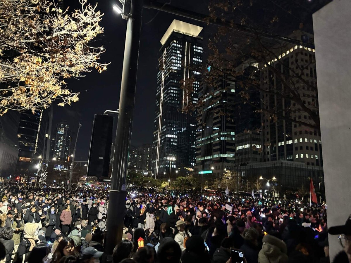 12月3日非常戒厳令が発令された夜に、たくさんの韓国人が国会前に集まった。