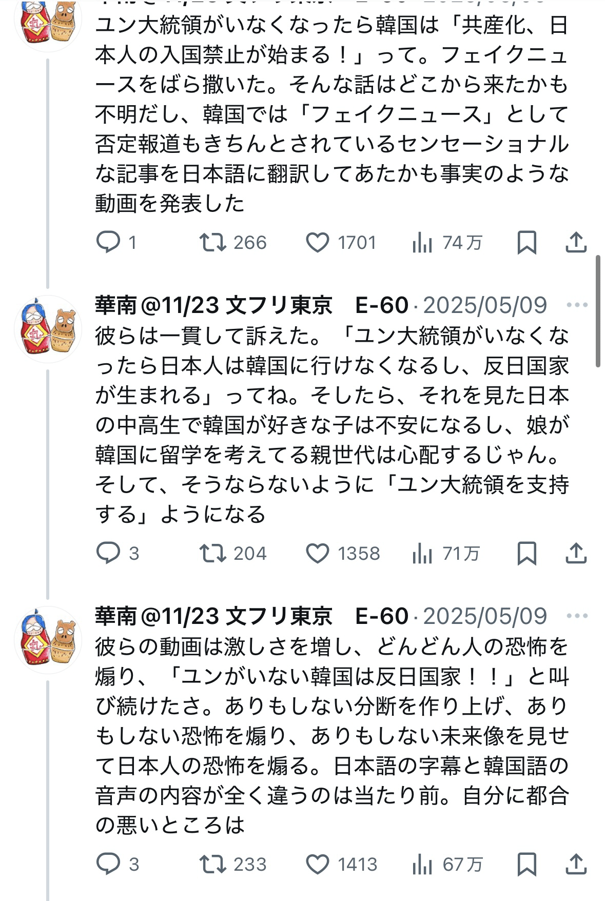 それなのに、韓国の人たちが自分の未来のために必死でやってることを、日本語と韓国語という言葉の狭間を好き勝手にいいように利用して「親日反日の問題」にすり替えて、尹に都合のいい主張を撒き散らかし、フェイクニュースを本当のことのように扱うやり方は卑怯の極みとしか言いようがない。